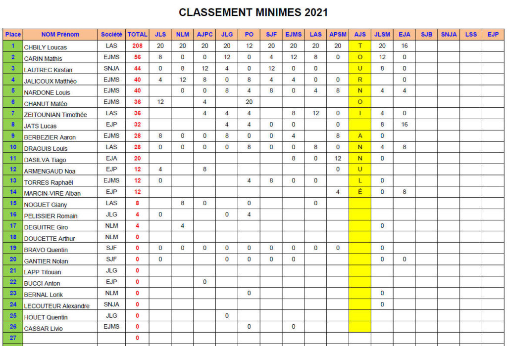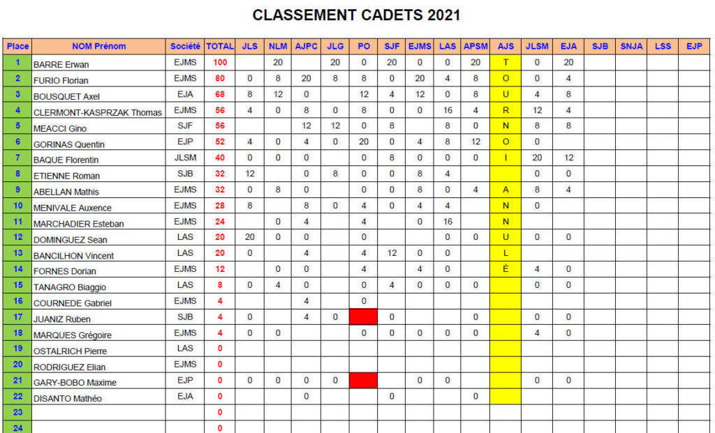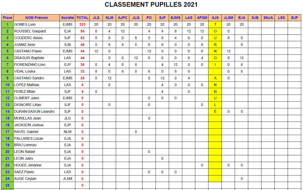 Voici les classements (provisoires) du championnat de ligue 2021 arrêtés au 12 08 2021 (attention pour le moment les jouteurs ayant le même nombre de points sont classés par ordre alphabétique, le classement définitif sera établi correctement selon le règlement de la ligue) :
