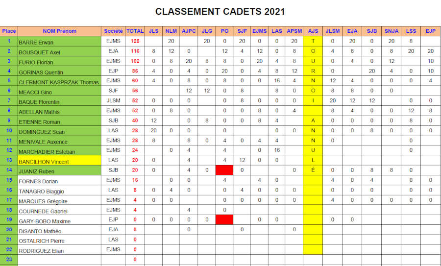 Voici les classements définitifs du championnat de ligue 2021 arrêtés au 28 08 2021 (surlignés en vert, les qualifiés pour les championnats de France, surlignés en jaune les absents, blessés ou suspendus) :