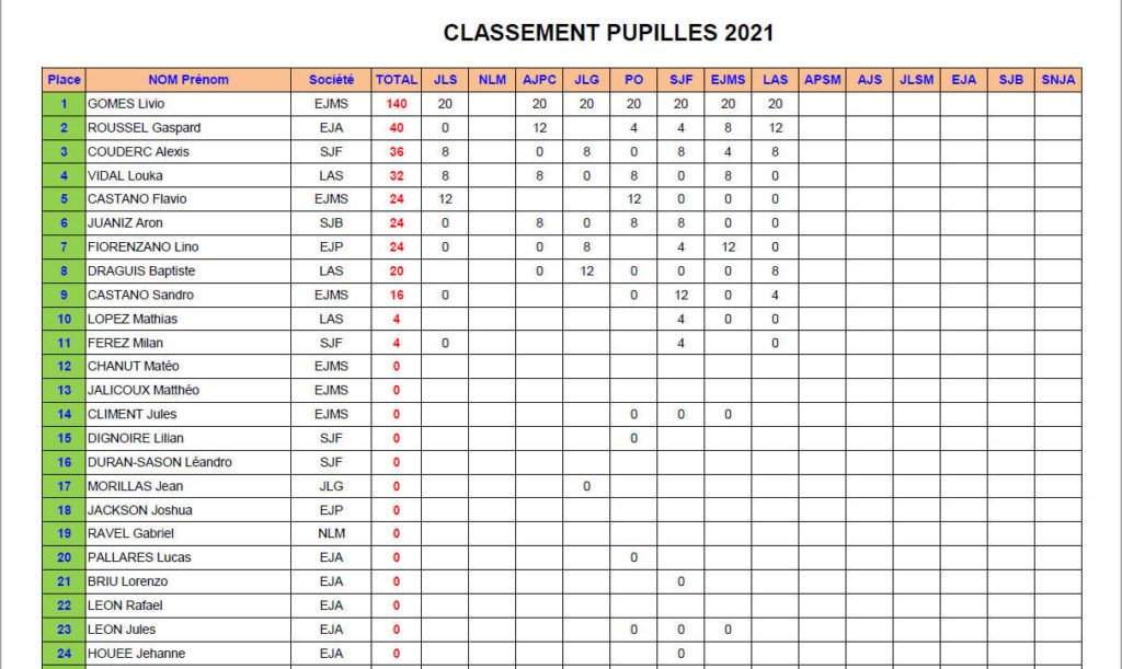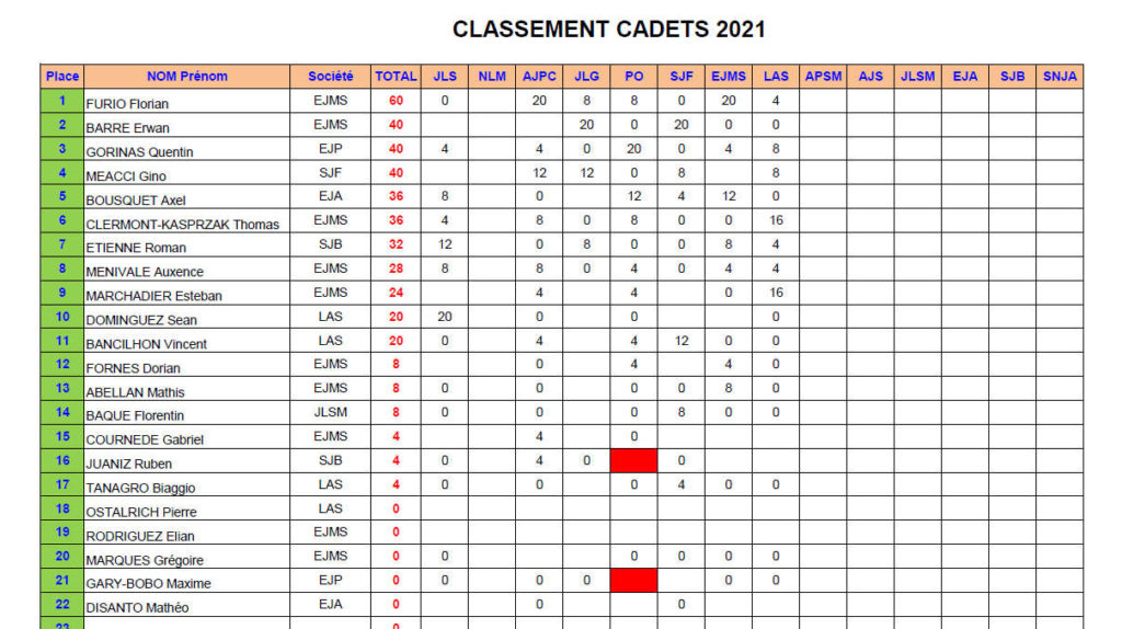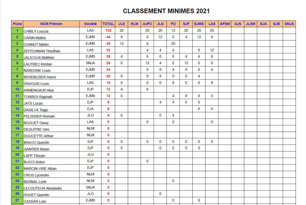 Voici les classements (provisoires) du championnat de ligue 2021 (attention pour le moment les jouteurs ayant le même nombre de points sont classés par ordre alphabétique, le classement définitif sera établi correctement selon le règlement de la ligue) :