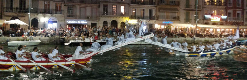 Jouteurs participant embarqués dans une nacelle avec des torches, barques immobiles au centre du cadre, public à l’écoute du discours émouvant de Francis Le Bail.
