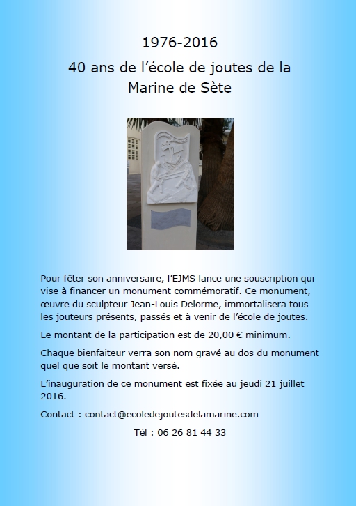 Pour fêter son anniversaire, l’EJMS lance une souscription qui vise à financer un monument commémoratif. Ce monument, œuvre du sculpteur Jean-Louis Delorme, immortalisera tous les jouteurs présents, passés et à venir de l’école de joutes.